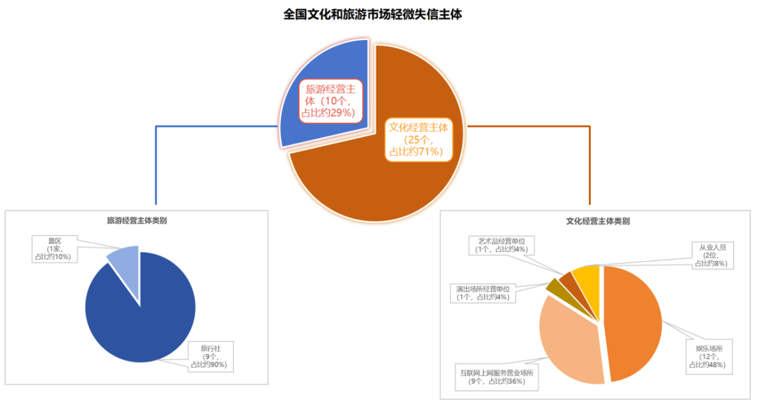 一是信用监管震慑力进一步增强。各级文化和旅游行政部门依法依规开展失信主体认定与管理工作,截至2023年7月底,江苏、福建、广东、贵州、云南等15个省份共认定文化和旅游市场失信主体123个,其中,严重失信主体88个,轻微失信主体35个。严重失信主体包括文化经营主体60个,涉及娱乐场所24家、互联网上网服务营业场所13家、互联网文化经营单位5家、演出经纪机构2家以及从业人员16名;旅游经营主体28个,涉及旅行社15家、导游1名、从业人员12名。轻微失信主体包括文化市场主体25个,涉及娱乐场所12家、互联网上网服务营业场所9家、演出场所经营单位1家、艺术品经营单位1家、从业人员2名;旅游市场主体10个,涉及旅行社9家、景区1家。轻微失信主体信用修复16家,涉及旅行社、娱乐场所、互联网上网服务营业场所等领域。严重失信主体均通过文化和旅游部政府门户网站同步公开并实施相应的管理措施,进一步增强了信用监管的震慑力。