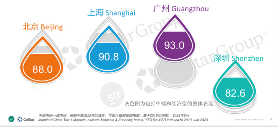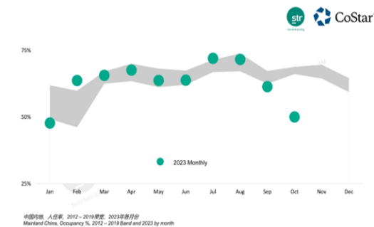 STR发布的2023年十一长假期间上海的相关数据显示,尽管上海的整体水平超过了2019年,但以浦江两岸为代表的城市核心商务区域,入住率仍未超过2019年同期水平。