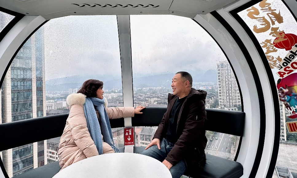 活动自启动以来,便迎来了络绎不绝的返乡客人。他们的脸上洋溢着归乡的喜悦,有的手持车票,有的紧握机票,每个人的心中都满载着对家乡的思念与期待。顾客刘女士激动地说:“在外工作的一年里,总听家乡人提及摩天轮的壮丽,心中一直怀揣着回乡体验的愿望;在高铁上便收到了此次活动信息,一出高铁站就径直来到永川里乘坐体验。”顾客们乘坐摩天轮之后,内心感慨不已。他们纷纷表示,家乡这一年的发展变化如此之大,在摩天轮高空可以一览无遗地欣赏到家乡崭新的面貌:创新的会展中心、智能的科技片场、先进现代化的城市交通……这一切都让他们感到自豪和激动,也非常感谢永川里新春的福利活动。